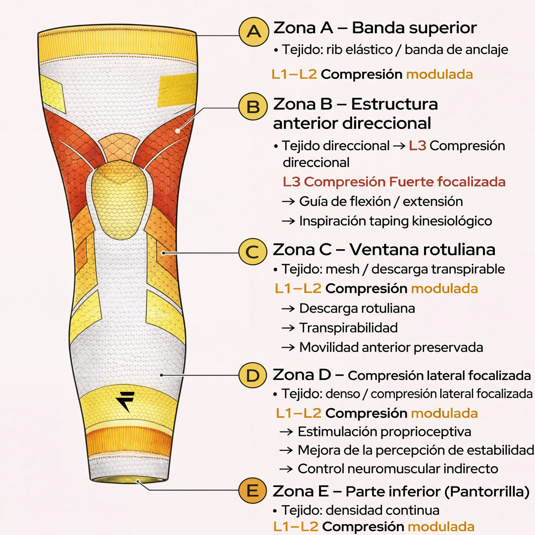 Nuestros soportes integran una arquitectura textil estructurada por zonas, con distintos niveles de compresión (L1 a L3) adaptados a las necesidades biomecánicas de cada articulación.