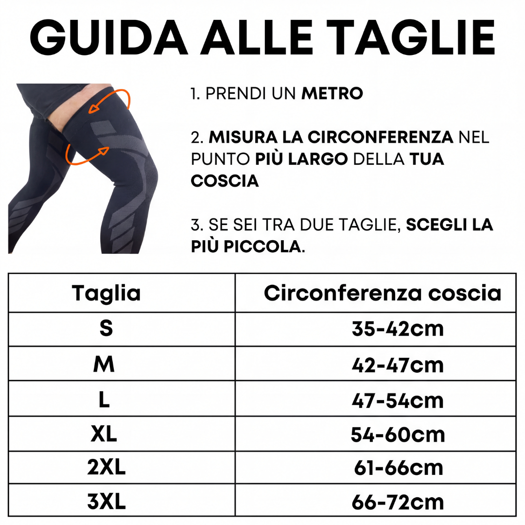 Prendi un metro a nastro , misura la circonferenza della gamba nella parte più larga della coscia superiore e consulta la tabella per scegliere la taglia che ti offrirà il miglior supporto.